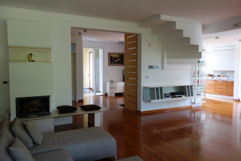 P: visoki stropi višine 2,90 cm, zelo velika in arhitekturno razgibana dnevna soba s kaminom, kuhinja in jedilnica za 12 oseb, velika pisarna – lahko tudi spalnica, wc, prostoren predprostor z garderobnimi omarami, garsonjera z ločenim vhodom, ki je popolnoma opremljena za samostojno bivanje (spalni del, kuhinja, kopalnica)